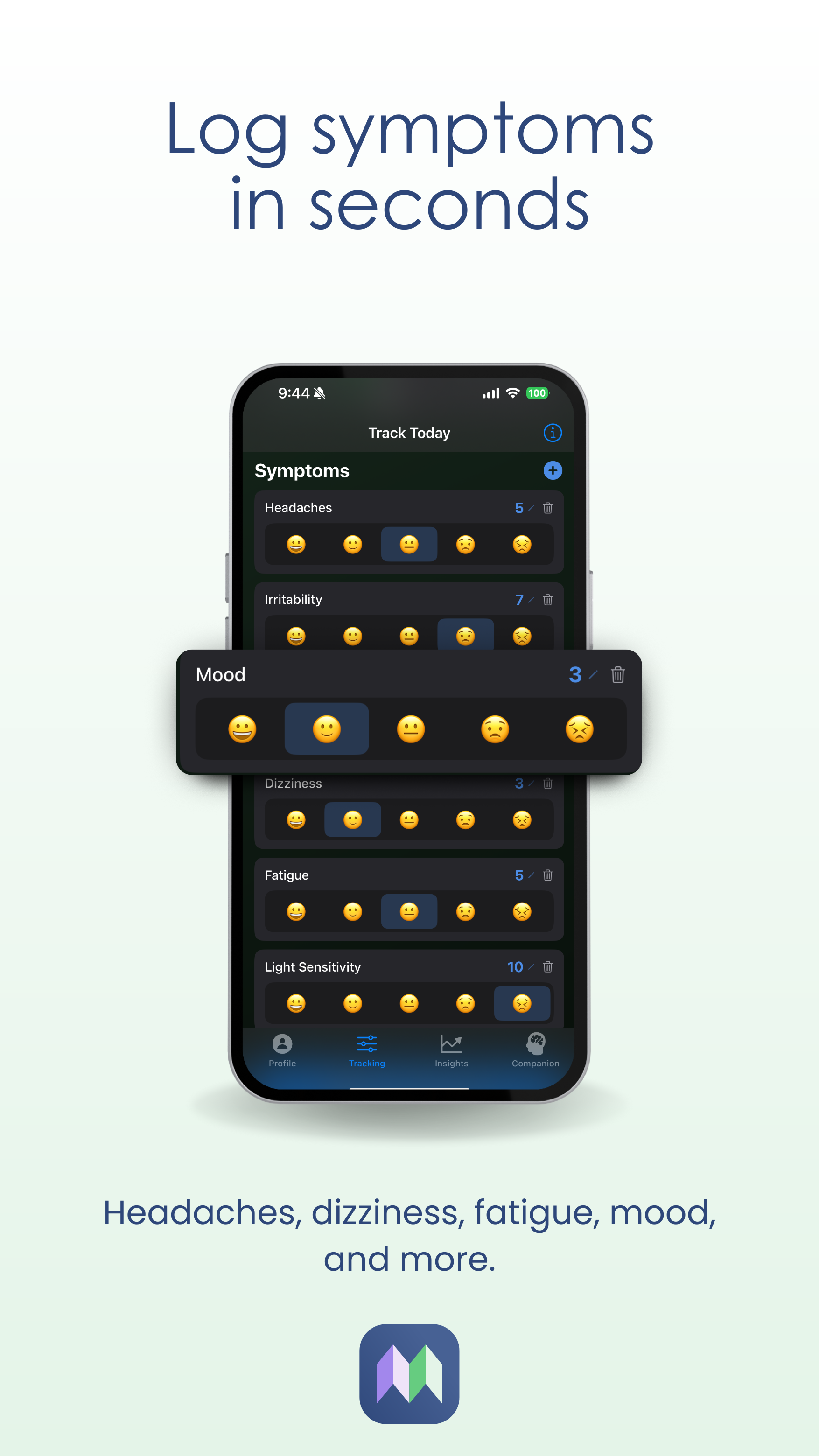 Track common symptoms such as headaches, fatigue, dizziness, mood changes, and sleep quality through short daily check ins.